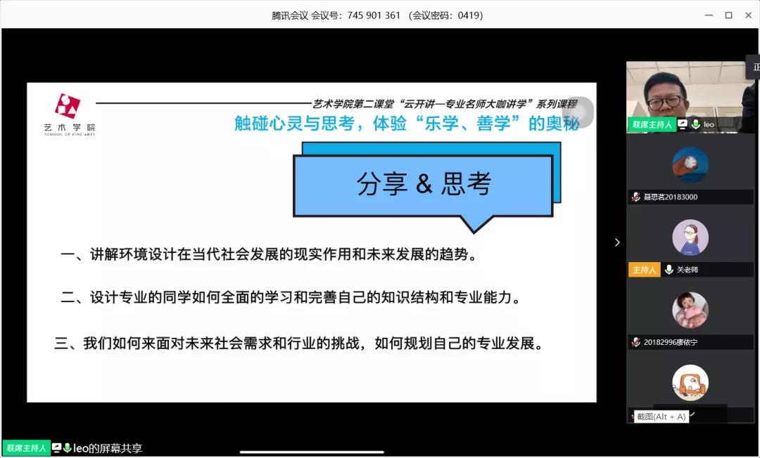 4月19日下午,藝術(shù)學院第二課堂“云開講——專業(yè)名師大咖講學”系列講座第一期開講。講座邀請藝術(shù)學院環(huán)境設計系教授、碩士生導師劉宇老師,為同學們展開題為“基于對專業(yè)熱愛的思考與分享”的分享與交流。藝術(shù)學院140余名學生通過騰訊會議平臺線上聆聽并參與了本場講座。