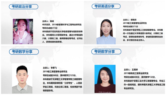 4月1日-2日,為期兩天的分享會吸引了近300名大二、大三學子參與。2019級碩士研究生陳碩、柴明月、李費飛、王昊婷分別結合自身考研歷程,詳細分享了考研政治、英語和數學的寶貴復習經驗,并在提問環節中認真解答同學們在備考過程中的各種疑問,提供了硬核備考方案。會前直播交流、會中科目詳解、會后單獨指導的模式,深受同學們的喜愛和好評,也促進了與優秀學長學姐的交流。