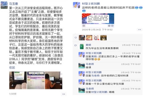 自材料學院啟動線上教學以來,學院的專業老師認真細致講授每一堂課,實時觀察學生線上學習的質量和效率,保障在線學習與線下課堂教學的效果同質化。“同上一堂課”活動更是受到了學生、家長的積極回應和認可,加深了教師與學生家長之間交流,不僅提升了學院的社會美譽度,還成為招生宣傳的一張明信片。家長們聽課后紛紛表示:這個活動非常有意義,疫情使我們家長也能夠跟孩子一起聽大學老師上課,很難忘。今后會全力支持配合學校、學院相關工作,營造良好的家庭學習氛圍,及時督促孩子的學習進度。17級材物專業張婉怡的家長說:“今天聽了班主任傅老師的課,真真切切的感受到了老師們每一次的辛苦付出,幽默風趣的講課方式使孩子聽課更加專注,這一次也在這里對老師們說一聲您辛苦啦!這次疫情對每一個孩子,家長,老師都是一次大考驗,愿疫情早日過去,早日一起渡過難關!”