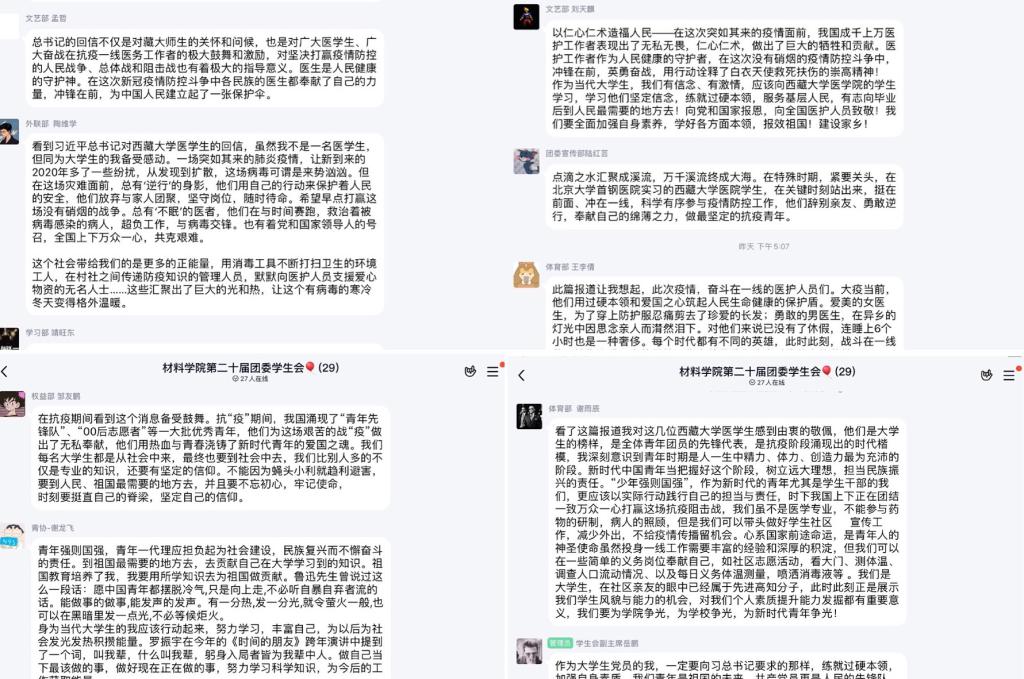 據悉,材料學院將繼續開展線上交流研討活動,引導全院學生深入學習領悟習近平總書記對防疫工作的各項指示,在舉國上下抗擊疫情的關鍵時刻,把總書記的真摯囑托內化于心、外化于行,奉獻自己的青春力量,練就過硬本領造福人民群眾,肩負起新時代青年應有的使命和擔當。