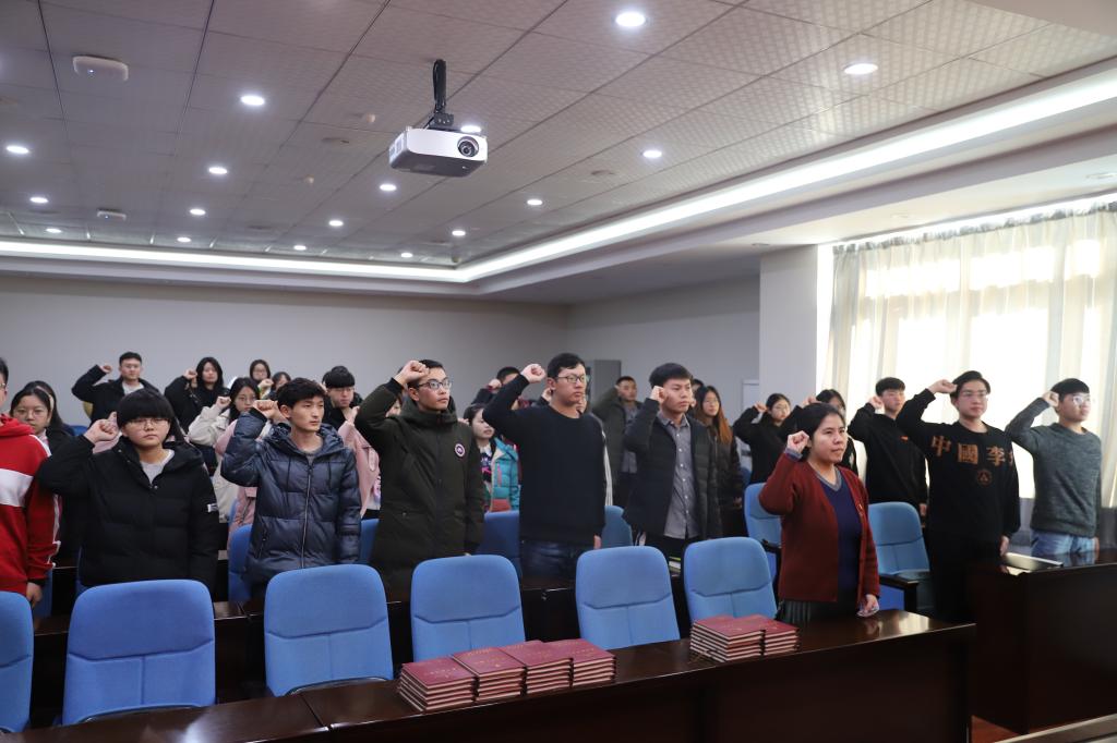 宣誓儀式上,黨委副書記馮增振宣讀了《關于材料科學與工程學院黨委批準接收39名同學為中共預備黨員的決定》。之后,劉歡老師帶領39名新黨員莊嚴宣誓,他們慷慨激昂的聲音傳達出了對黨的無限忠誠。隨后,老師們為全體新黨員佩戴黨徽并分發黨員學習筆記本。17級材物1班沈會友同學代表全體新黨員發言,表示要時刻保持共產黨員的先進性,恪守入黨誓詞,牢記全心全意為人民服務的宗旨,充分發揮黨員的先鋒模范作用,無愧于共產黨員的光榮稱號。宣誓儀式后,黨委書記馬紅健為全體新黨員們做《我入黨了》專題黨課,并結合十九屆四中全會精神對各位預備黨員做形勢政策教育。