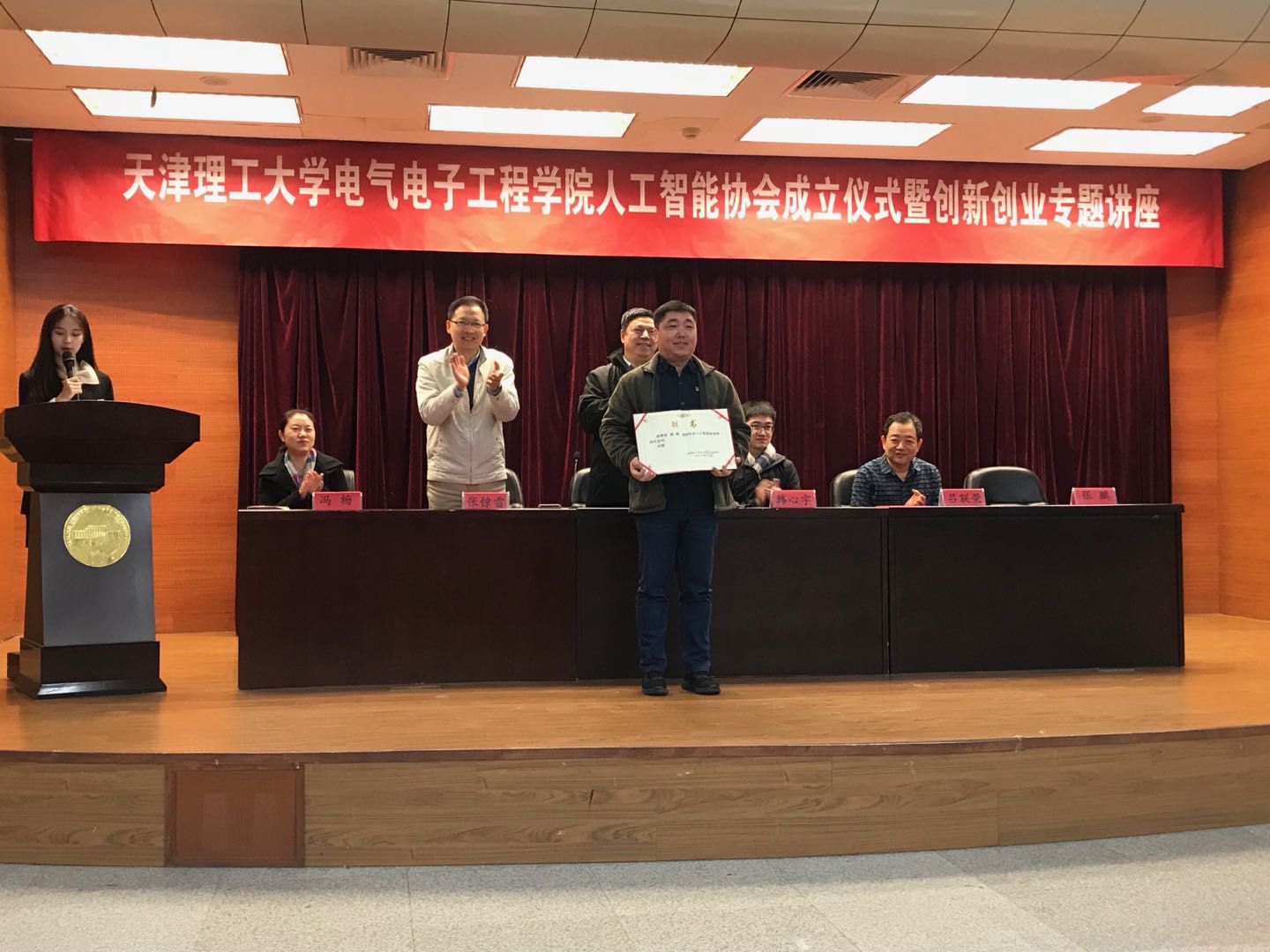 儀式上,張寶峰院長首先介紹電氣電子工程學院現有的創新實踐平臺的基礎上,通過不斷創新與整合,成立“人工智能協會”,再次為學院學生搭建了一個具有3E學院特色的專業性、創新性、學術型、學習型平臺。隨后,張寶峰院長與張驚雷處長為人工智能協會指導老師頒發聘書,副院長呂聯榮與馮楊書記為人工智能協會會長頒發聘書。張驚雷處長在講話中指出組建“人工智能協會”是能夠激發學生鉆研科學知識的熱情,為學生提供一個與時代接軌的學習窗口,希望加入協會的同學們真正克服困難和迷茫,發揮毅力和耐心,不要放棄,堅持學習。最后,張鵬主任作了題為《人工智能與大學生創新創業》的專題報告,從人工智能的歷史沿革、計算機視覺的發展、人工智能的產業化等角度,作了生動幽默的講述。