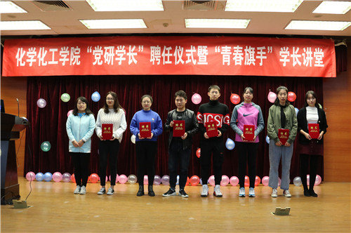 10月31日晚,“黨研學長”聘任儀式暨青春旗手第三季第一期講座在理學院舉行。聘任儀式上,黨支部書記為研究生學長頒發“黨研學長”聘書。張璐、陳佩雯、柏暢、劉珊、汪青青、王順、高明校七位“黨研學長”分別圍繞化工專業就業前景、大學生活規劃、學習與科研、就業與考研等方面與新生進行成果交流。會后學長與新生以“雙選會”的形式,組成“黨研學長”與新生的幫扶組合。