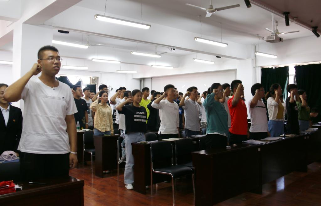 儀式上,2019級團員代表朱倩怡同學在國旗下演講,她結合軍訓感受分享了她作為一名青年對愛國主義與奮斗精神的理解,并表達了新時代青年繼承和發揚五四精神,勇擔使命、奮發向前的決心。隨后,老師為新生團員代表佩戴團徽,在場團員一同重溫入團誓詞,深刻理解團員的使命與擔當。