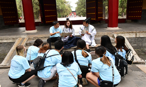 社會實踐的第一天實踐團師生來到了儒家文化發(fā)源地——山東曲阜,“圣城儒學,映古輝近”,山東曲阜是孔子的故鄉(xiāng),孔夫子生前在此開壇授學,首創(chuàng)儒家文化,為此后2000多年的中國歷史深深地打上了儒學烙印。在孔廟,留學生們身著孔服,中外師生用最原始的授課方式,共同誦讀《論語》,這種最直擊心靈的文化體驗,使大家對中華文化中的“仁、義、禮、智、信”有了更深的理解;在孔府,中外師生與當?shù)匦W生一同交流中國形象與中國符號,暢談自己對“一帶一路”的理解。在孔林,中外同學自發(fā)以先師禮莊重祭拜,一表自己對圣賢的景慕之情。