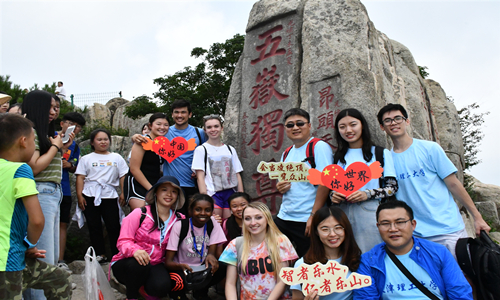 社會實踐的第二天實踐團師生來到了齊魯文化孕育圣地——泰山,泰山有著“中華國山”、“天下第一山”之美譽。在這里,孔子留下了“登泰山而小天下”的贊嘆,杜甫更是寫下了“會當凌絕頂,一覽眾山下”的千古絕唱。在登山過程中,中外師生共同感受泰山濃厚的文化底蘊和詩詞氛圍,體會中國傳統(tǒng)詩詞和中國書法在此所遺留下來的文化魅力。中外同學互相鼓勵,互相扶持,分解小目標,鼓足精氣神,雖然在十八盤遇到了山雨,但同學們絕不放棄,互幫互助,不斷克服登山過程中的困難,最終順利抵達頂峰。留學生陳國安說:“這是我第一次在中國爬山,泰山不僅讓我感受到了自然的美,更讓我感受到了他濃厚的文化底蘊?!?/p>