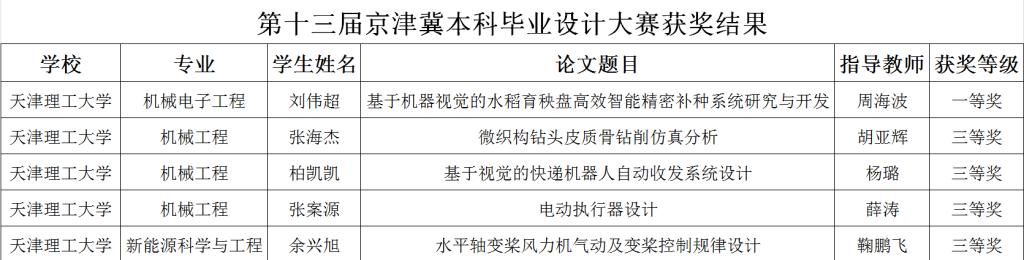 2019年6月12日,第十三屆“廣數杯”京津冀本科畢業設計大賽決賽在天津大學舉辦,我校機械工程學院5位學生入圍本次決賽,經過現場展示和答辯環節,奪得一等獎1項,三等獎4項。