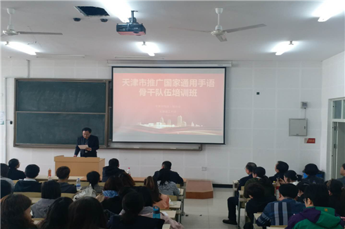 日前,由天津市殘疾人聯合會和天津理工大學共同舉辦的天津市推廣國家通用手語骨干隊伍培訓班在我校成功開班,來自市、區殘聯系統及市政府殘工委各成員單位和市級窗口單位等部門300名工作人員參訓,市殘聯黨組成員、副理事長李津海同志出席開班儀式并做動員講話。