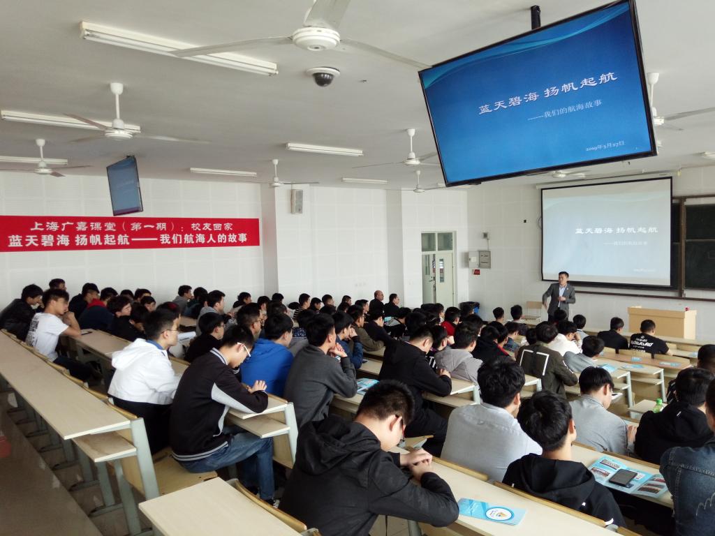 為大力開展校友工作,充分發揮校友榜樣示范作用,加強校企合作,匯聚合力培養航海人才。3月27日,上海廣嘉楊俊偉輪機長一行3人走進學生課堂,給同學們帶來一場主題為“藍天碧海 揚帆起航—我們航海人的故事”的精彩報告,2016、2017級學生代表參加活動。