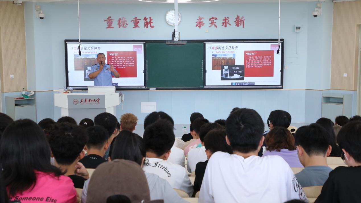 天津市戒毒局蒲公英宣講團成員邵偉峰結合生動案例,對來自各學院的200名師生詳細講解了毒品的類型、吸食毒品的危害,引導廣大學生樹立正確的價值觀,自覺遠離藥物毒品,提升自我保護技能,擁抱積極人生。