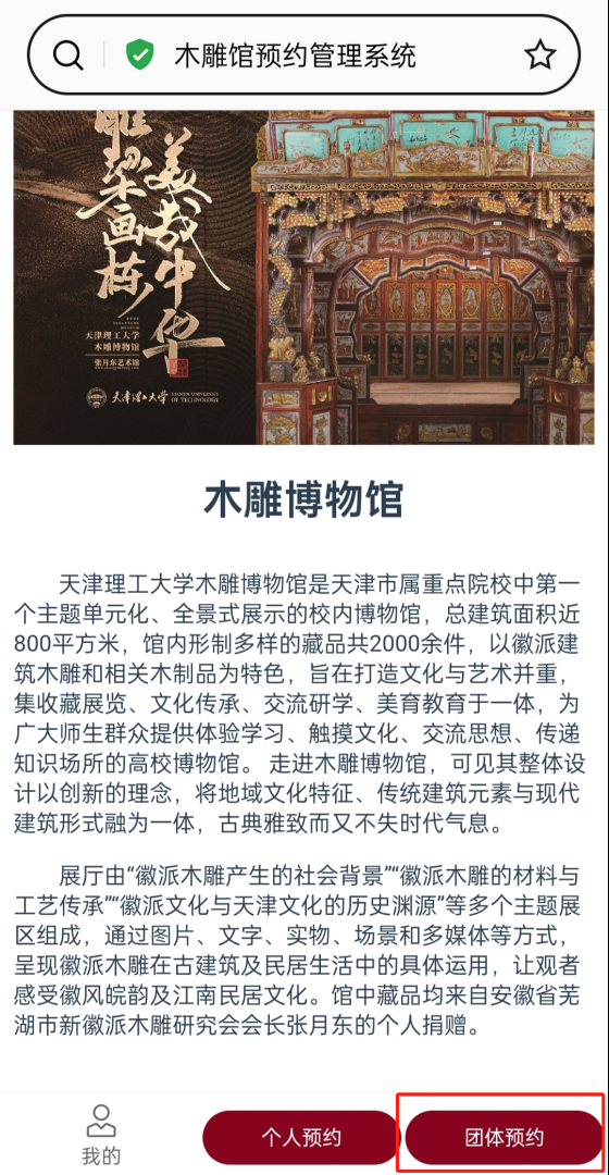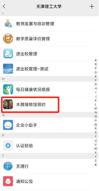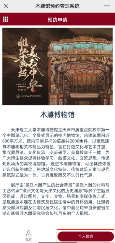 1.手機端進入天津理工大學企業微信號(電腦端進入天津理工大學易網成·融合門戶),搜索“木雕博物館預約”應用,點擊“個人預約”。