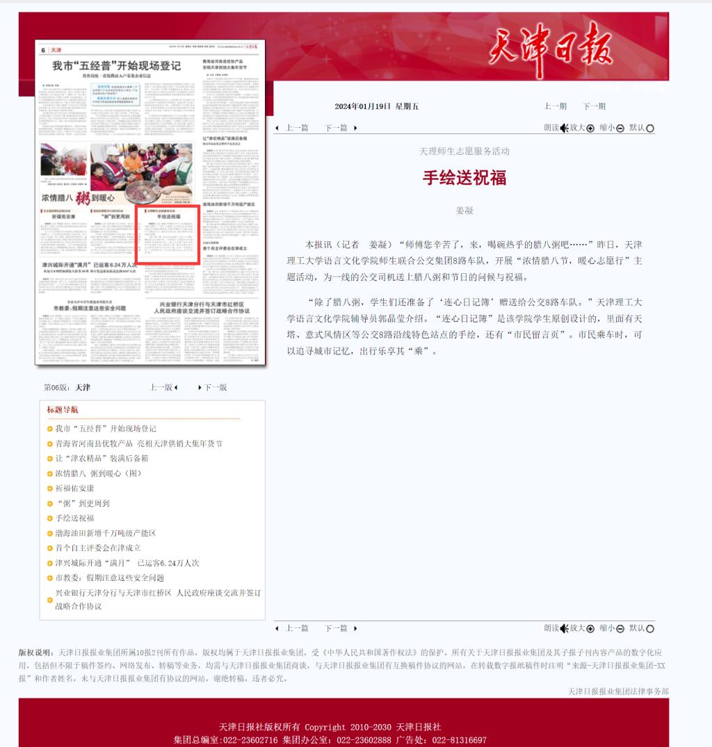 “除了臘八粥,學(xué)生們還準(zhǔn)備了‘連心日記簿’贈(zèng)送給公交8路車隊(duì)。”天津理工大學(xué)語言文化學(xué)院輔導(dǎo)員郭晶瑩介紹。“連心日記簿”是該學(xué)院學(xué)生原創(chuàng)設(shè)計(jì)的,里面有天塔、意式風(fēng)情區(qū)等公交8路沿線特色站點(diǎn)的手繪,還有“市民留言頁”。市民乘車時(shí),可以追尋城市記憶,出行樂享其“乘”。