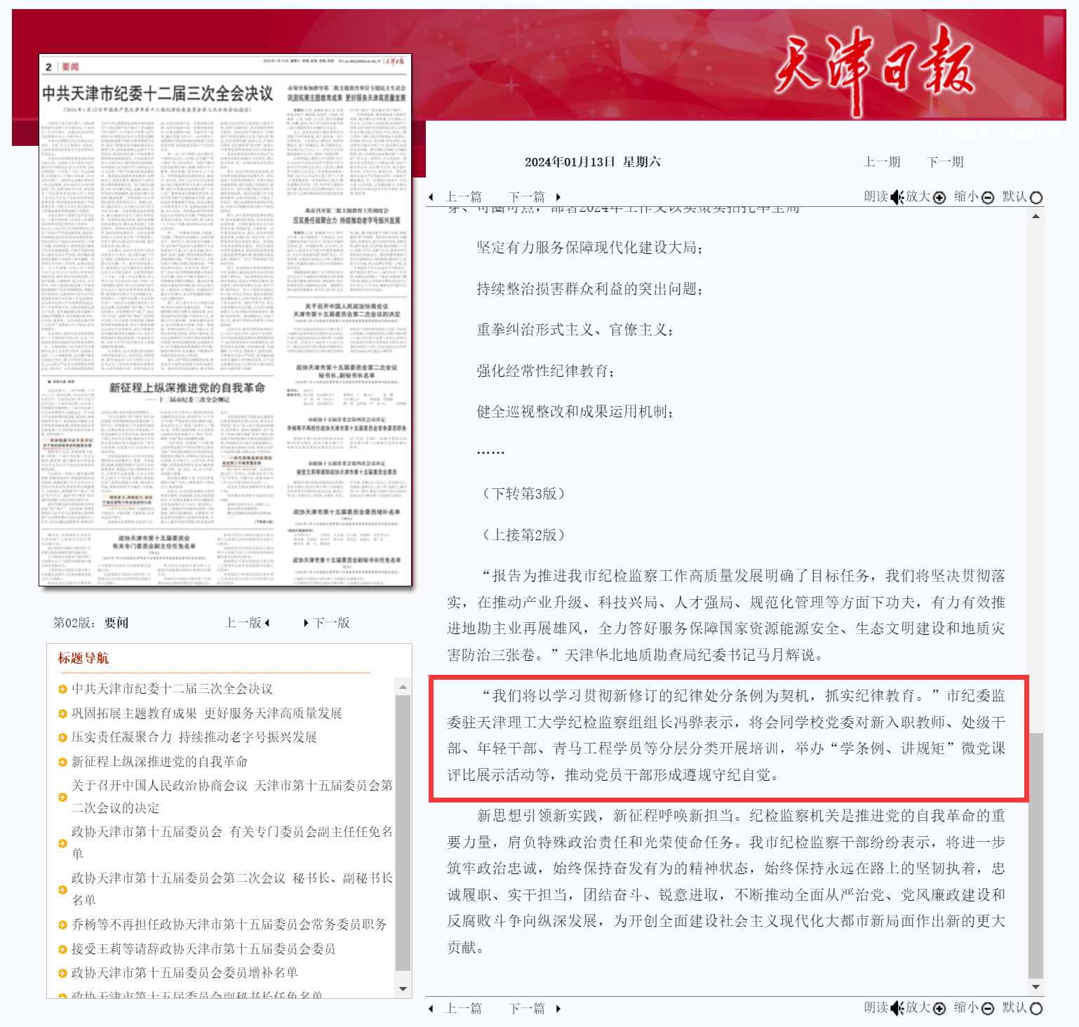 “我們將以學習貫徹新修訂的紀律處分條例為契機,抓實紀律教育。”市紀委監(jiān)委駐天津理工大學紀檢監(jiān)察組組長馮驊表示,將會同學校黨委對新入職教師、處級干部、年輕干部、青馬工程學員等分層分類開展培訓,舉辦“學條例、講規(guī)矩”微黨課評比展示活動等,推動黨員干部形成遵規(guī)守紀自覺。
