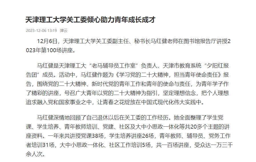 12月6日,天津理工大學(xué)關(guān)工委副主任、秘書長馬紅健老師在圖書館報告廳講授2023年第100場講座。