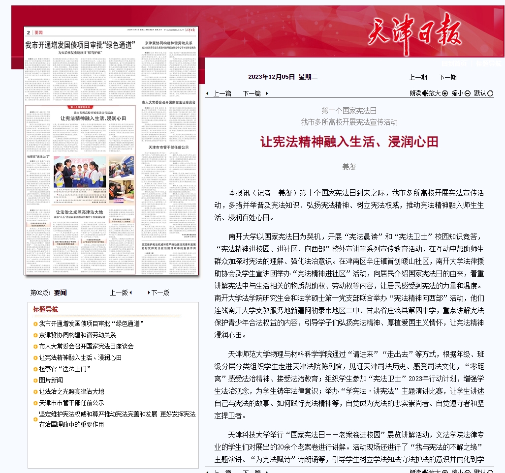 本報訊(記者 姜凝)第十個國家憲法日到來之際,我市多所高校開展憲法宣傳活動,多措并舉普及憲法知識、弘揚憲法精神、樹立憲法權(quán)威,推動憲法精神融入師生生活、浸潤百姓心田。
