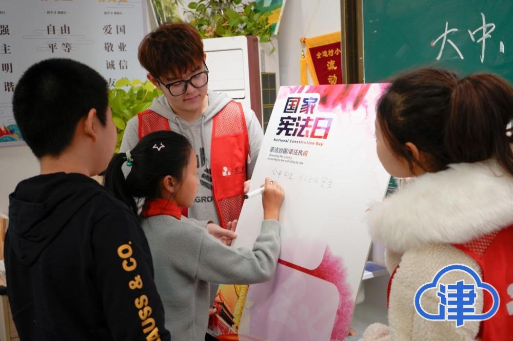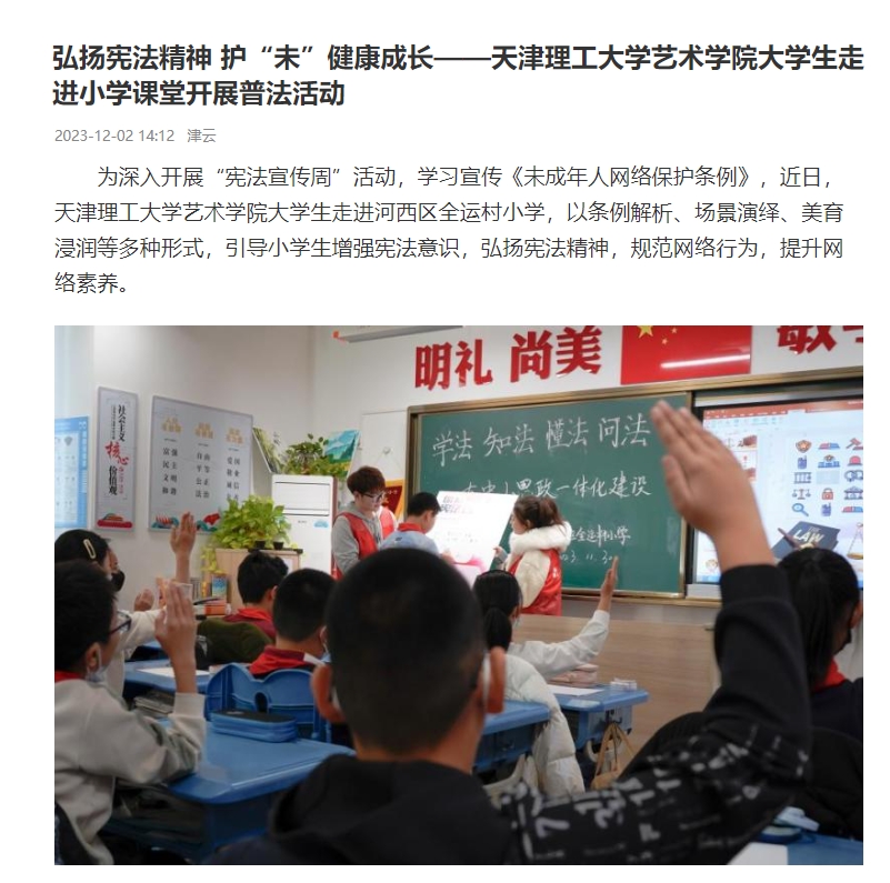 為深入開展“憲法宣傳周”活動,學習宣傳《未成年人網絡保護條例》,近日,天津理工大學藝術學院大學生走進河西區全運村小學,以條例解析、場景演繹、美育浸潤等多種形式,引導小學生增強憲法意識,弘揚憲法精神,規范網絡行為,提升網絡素養。