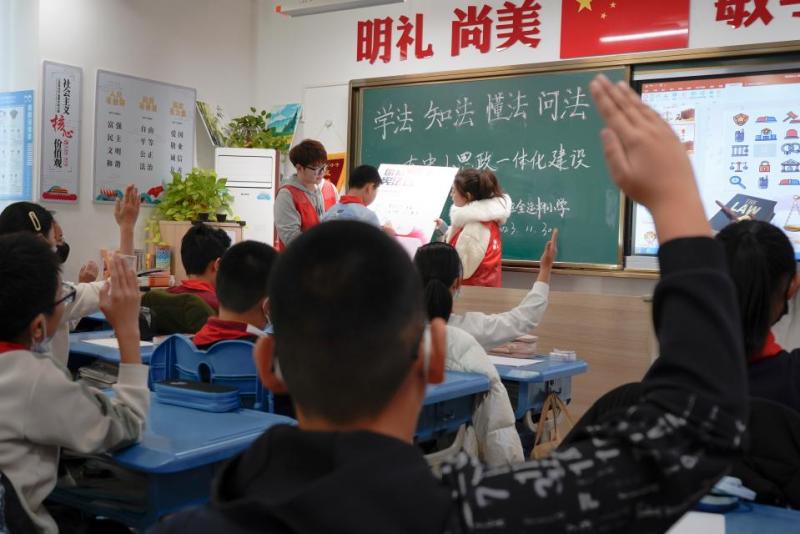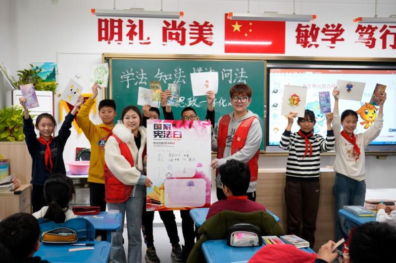 在課堂上,青年大學生帶領小學生們學習憲法,用實例向同學們講述憲法如何融入生活,如何為我們的健康成長保駕護航,引導同學們深刻領會憲法精神。