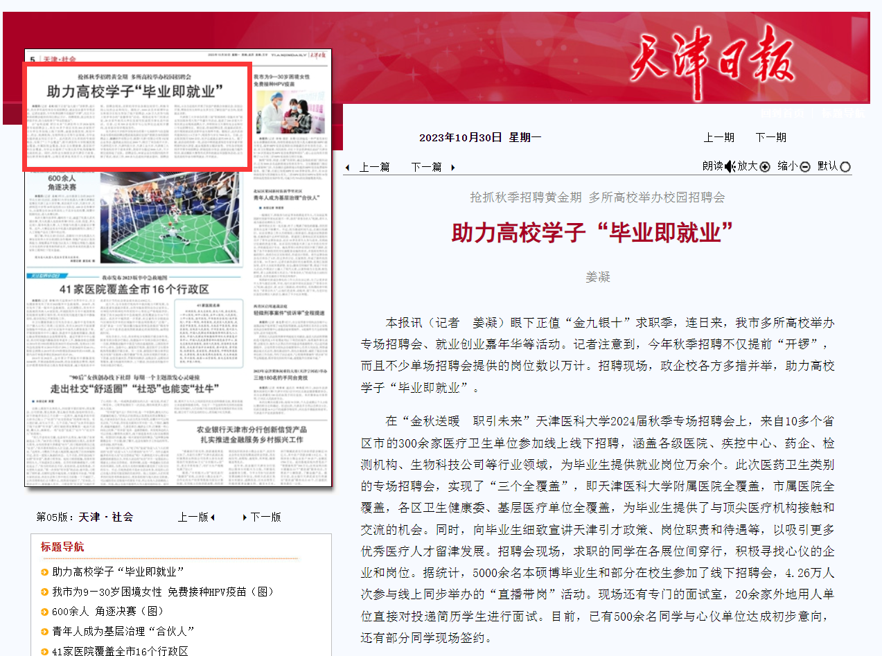 在“金秋送暖 職引未來”天津醫科大學2024屆秋季專場招聘會上,來自10多個省區市的300余家醫療衛生單位參加線上線下招聘,涵蓋各級醫院、疾控中心、藥企、檢測機構、生物科技公司等行業領域,為畢業生提供就業崗位萬余個。此次醫藥衛生類別的專場招聘會,實現了“三個全覆蓋”,即天津醫科大學附屬醫院全覆蓋,市屬醫院全覆蓋,各區衛生健康委、基層醫療單位全覆蓋,為畢業生提供了與頂尖醫療機構接觸和交流的機會。同時,向畢業生細致宣講天津引才政策、崗位職責和待遇等,以吸引更多優秀醫療人才留津發展。招聘會現場,求職的同學在各展位間穿行,積極尋找心儀的企業和崗位。據統計,5000余名本碩博畢業生和部分在校生參加了線下招聘會,4.26萬人次參與線上同步舉辦的“直播帶崗”活動。現場還有專門的面試室,20余家外地用人單位直接對投遞簡歷學生進行面試。目前,已有500余名同學與心儀單位達成初步意向,還有部分同學現場簽約。