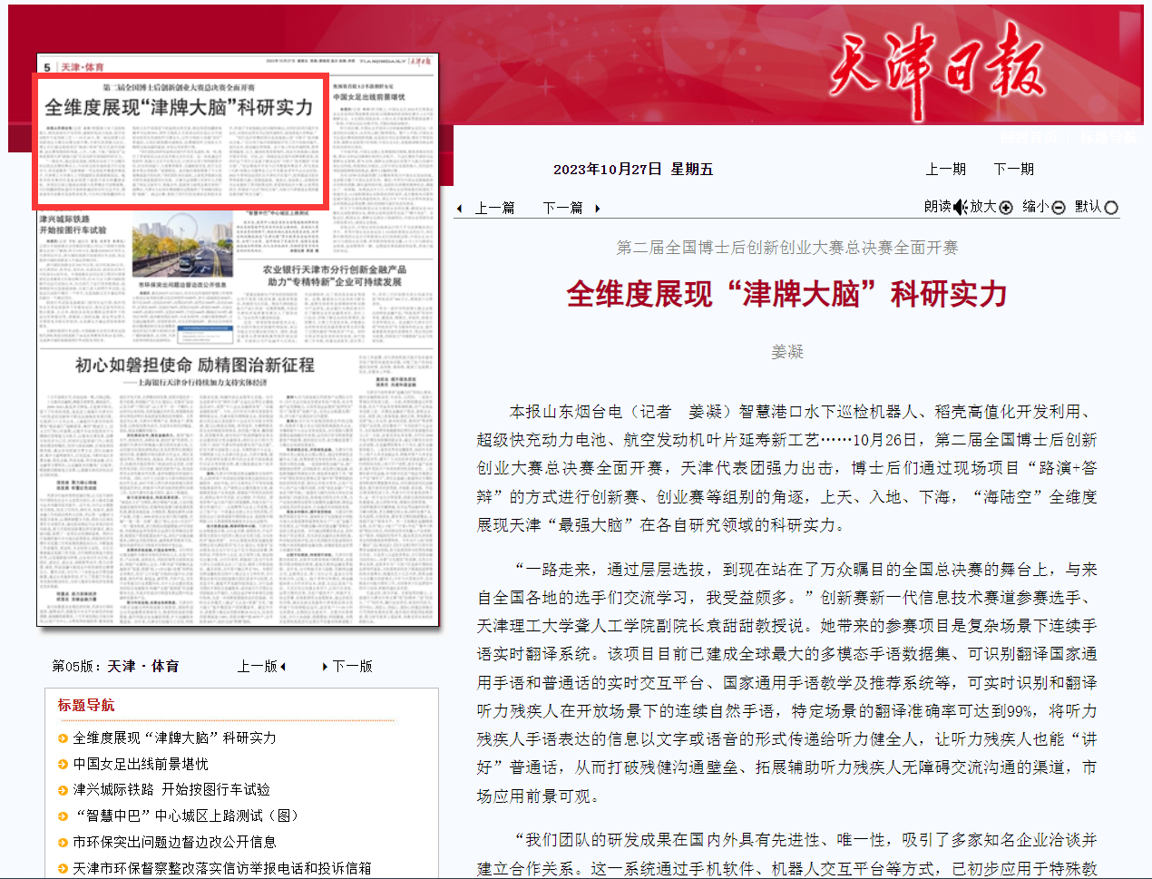 10月27日,《天津日報》報道我校聾人工學院副院長袁甜甜教授科研項目參加第二屆全國博士后創新創業大賽總決賽相關情況。