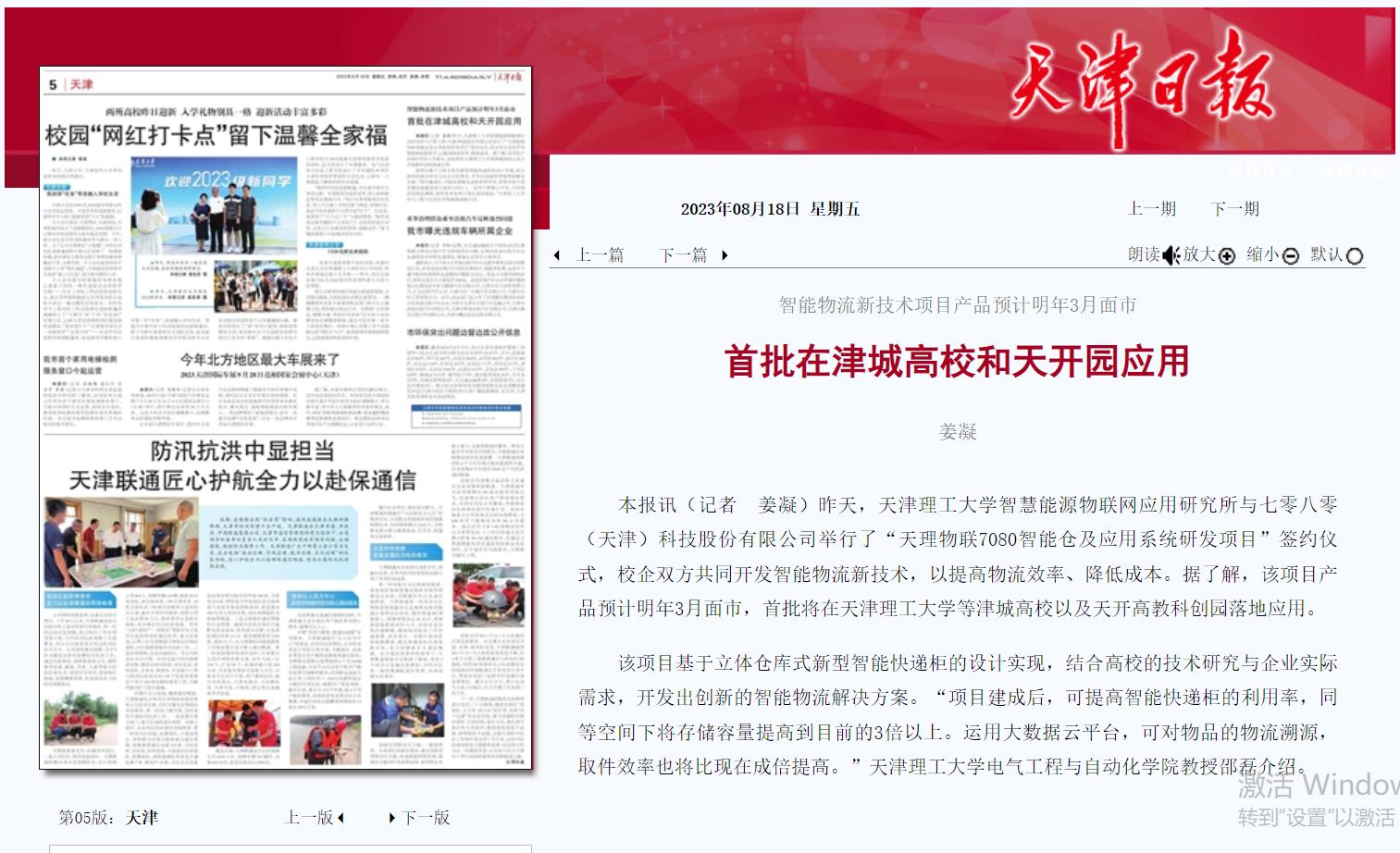 近日,《天津日?qǐng)?bào)》報(bào)道我校智慧能源物聯(lián)網(wǎng)應(yīng)用研究所與七零八零(天津)科技股份有限公司舉行了“天理物聯(lián)7080智能倉(cāng)及應(yīng)用系統(tǒng)研發(fā)項(xiàng)目”簽約儀式,校企雙方共同開(kāi)發(fā)智能物流新技術(shù),以提高物流效率、降低成本。全文如下: