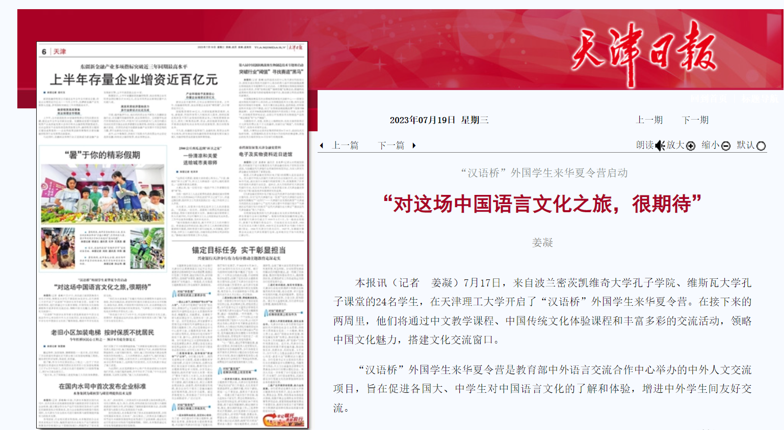 7月17日,來自波蘭密茨凱維奇大學孔子學院、維斯瓦大學孔子課堂的24名學生,在天津理工大學開啟了“漢語橋”外國學生來華夏令營。在接下來的兩周里,他們將通過中文教學課程、中國傳統文化體驗課程和豐富多彩的交流活動,領略中國文化魅力,搭建文化交流窗口。