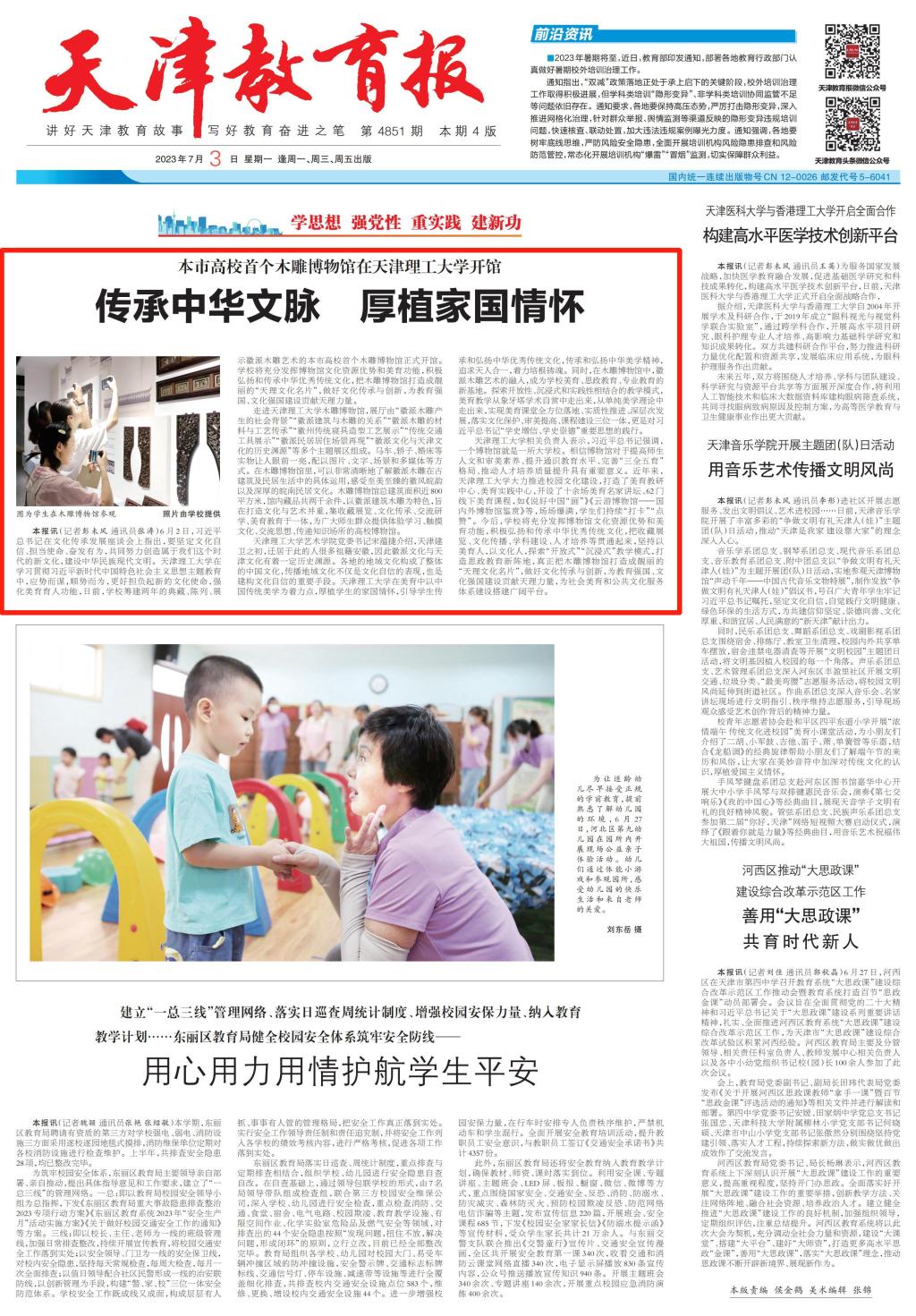 6 月 2 日,習(xí)近平總書記在文化傳承發(fā)展座談會(huì)上指出,要堅(jiān)定文化自信、擔(dān)當(dāng)使命、奮發(fā)有為,共同努力創(chuàng)造屬于我們這個(gè)時(shí)代的新文化,建設(shè)中華民族現(xiàn)代文明。天津理工大學(xué)在學(xué)習(xí)貫徹習(xí)近平新時(shí)代中國(guó)特色社會(huì)主義思想主題教育中,應(yīng)勢(shì)而謀,順勢(shì)而為,更好擔(dān)負(fù)起新的文化使命,強(qiáng)化美育育人功能,日前,學(xué)校籌建兩年的典藏、陳列、展示徽派木雕藝術(shù)的本市高校首個(gè)木雕博物館正式開館。學(xué)校將充分發(fā)揮博物館文化資源優(yōu)勢(shì)和美育功能,積極弘揚(yáng)和傳承中華優(yōu)秀傳統(tǒng)文化,把木雕博物館打造成靚麗的“天理文化名片”,做好文化傳承與創(chuàng)新,為教育強(qiáng)國(guó)、文化強(qiáng)國(guó)建設(shè)貢獻(xiàn)天理力量。