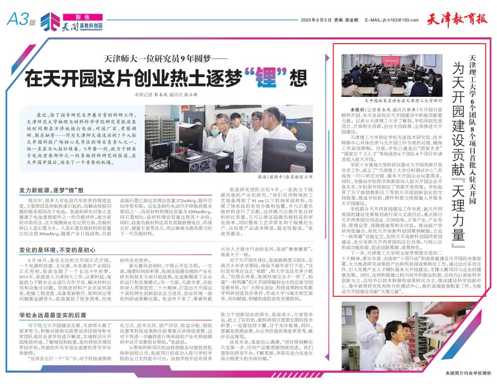 天津理工大學指定學校先進技術研究院、技術轉移中心具體負責與天開園工作專班的對接,確保工作高效順暢。目前,學校已遴選出“國家杰青”“國家百千萬人才”等構成的 6 個團隊 8 個項目申請首批入駐天開園。