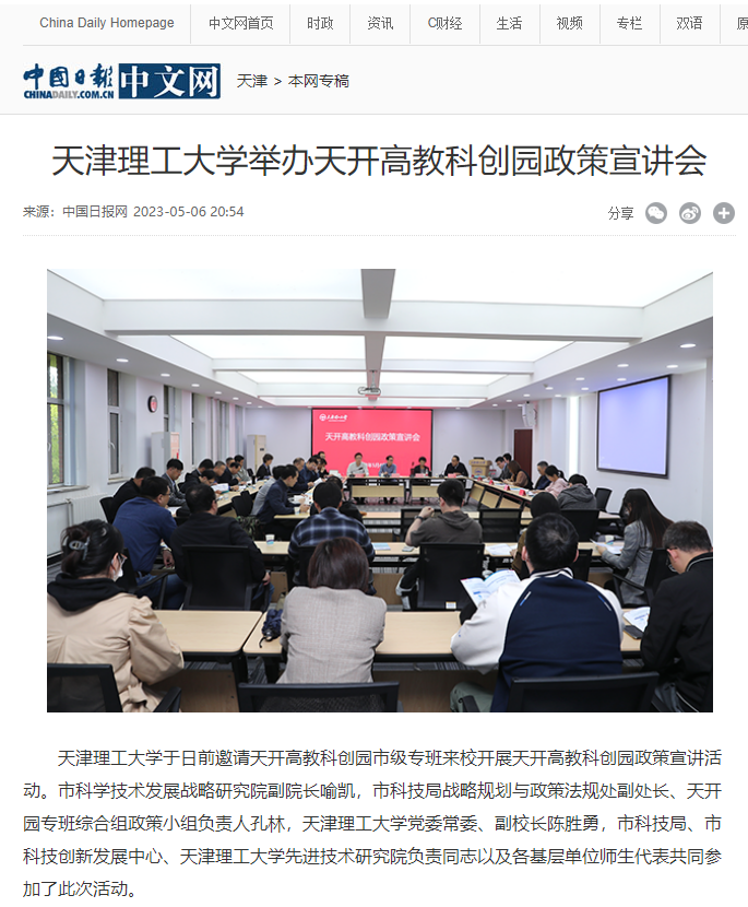 天津理工大學于日前邀請天開高教科創園市級專班來校開展天開高教科創園政策宣講活動。市科學技術發展戰略研究院副院長喻凱,市科技局戰略規劃與政策法規處副處長、天開園專班綜合組政策小組負責人孔林,天津理工大學黨委常委、副校長陳勝勇,市科技局、市科技創新發展中心、天津理工大學先進技術研究院負責同志以及各基層單位師生代表共同參加了此次活動。