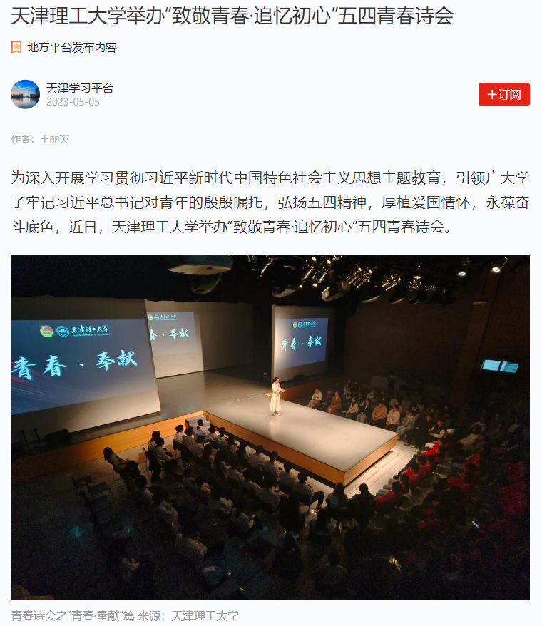為深入開展學習貫徹習近平新時代中國特色社會主義思想主題教育,引領廣大學子牢記習近平總書記對青年的殷殷囑托,弘揚五四精神,厚植愛國情懷,永葆奮斗底色,近日,天津理工大學舉辦“致敬青春·追憶初心”五四青春詩會。