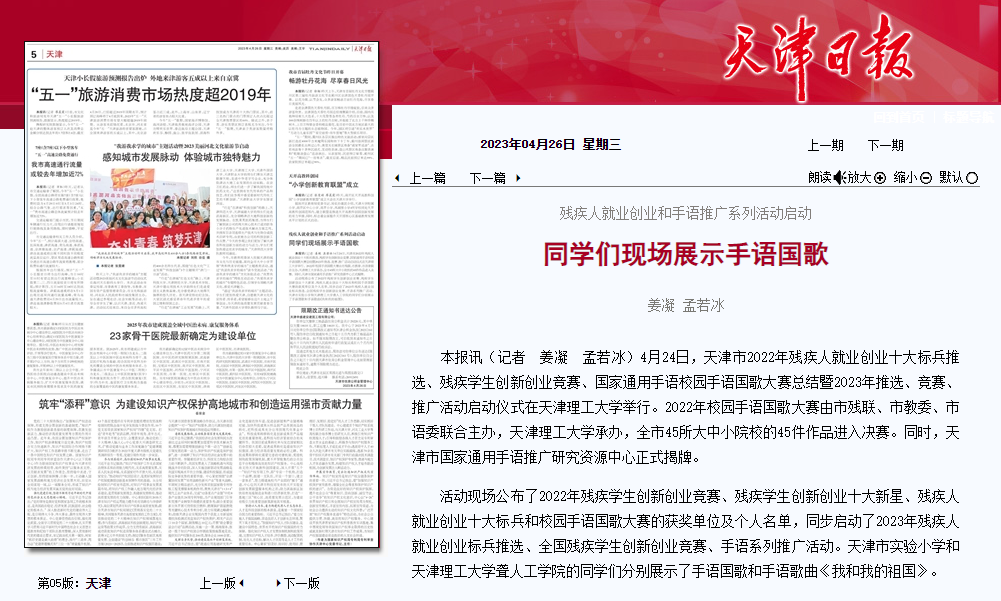 4月24日,天津市2022年殘疾人就業(yè)創(chuàng)業(yè)十大標(biāo)兵推選、殘疾學(xué)生創(chuàng)新創(chuàng)業(yè)競賽、國家通用手語校園手語國歌大賽總結(jié)暨2023年推選、競賽、推廣活動啟動儀式在天津理工大學(xué)舉行。2022年校園手語國歌大賽由市殘聯(lián)、市教委、市語委聯(lián)合主辦,天津理工大學(xué)承辦,全市45所大中小院校的45件作品進入決賽。同時,天津市國家通用手語推廣研究資源中心正式揭牌。