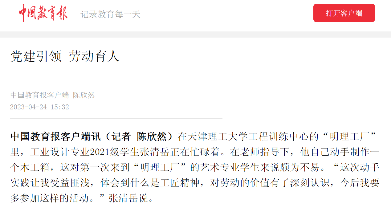在天津理工大學工程訓練中心的“明理工廠”里,工業設計專業2021級學生張清岳正在忙碌著。在老師指導下,他自己動手制作一個木工箱,這對第一次來到“明理工廠”的藝術專業學生來說頗為不易。“這次動手實踐讓我受益匪淺,體會到什么是工匠精神,對勞動的價值有了深刻認識,今后我要多參加這樣的活動。”張清岳說。
