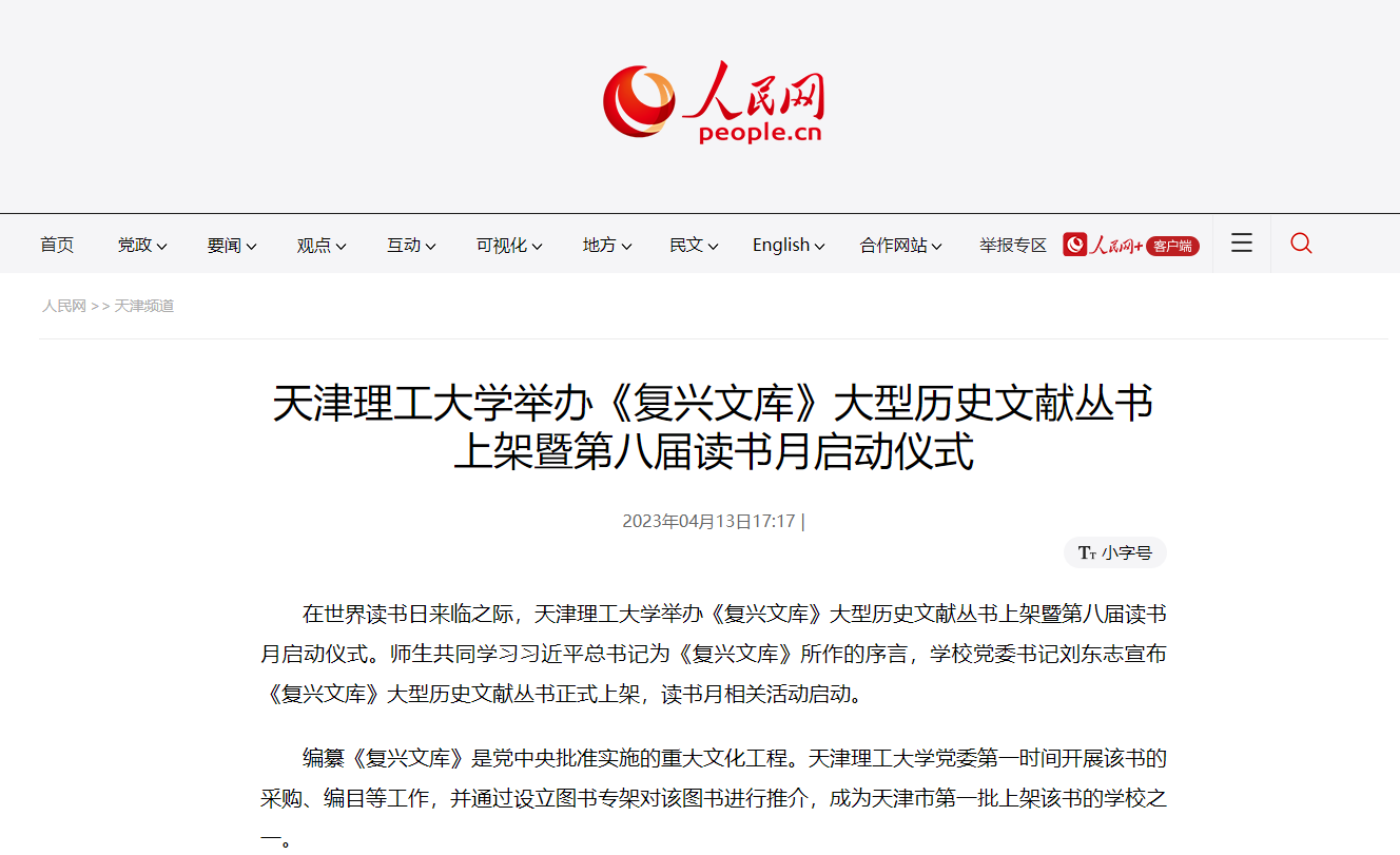 在世界讀書日來臨之際,天津理工大學舉辦《復興文庫》大型歷史文獻叢書上架暨第八屆讀書月啟動儀式。師生共同學習習近平總書記為《復興文庫》所作的序言,學校黨委書記劉東志宣布《復興文庫》大型歷史文獻叢書正式上架,讀書月相關活動啟動。