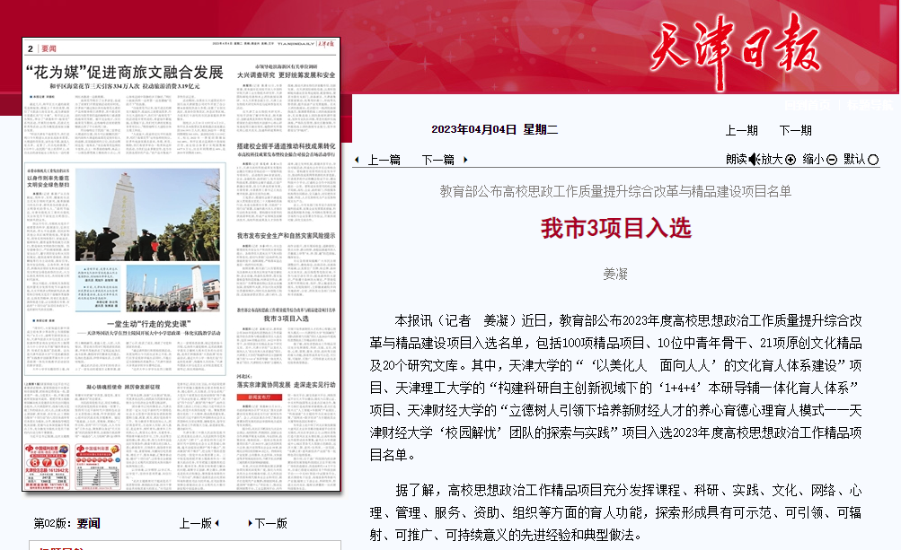 近日,教育部公布2023年度高校思想政治工作質量提升綜合改革與精品建設項目入選名單,包括100項精品項目、10位中青年骨干、21項原創(chuàng)文化精品及20個研究文庫。其中,天津大學的“‘以美化人 面向人人’的文化育人體系建設”項目、天津理工大學的“構建科研自主創(chuàng)新視域下的‘1+4+4’本研導輔一體化育人體系”項目、天津財經大學的“立德樹人引領下培養(yǎng)新財經人才的養(yǎng)心育德心理育人模式──天津財經大學‘校園解憂’團隊的探索與實踐”項目入選2023年度高校思想政治工作精品項目名單。