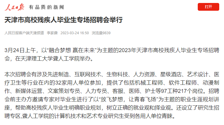 3月24日上午,以“融合夢想 贏在未來”為主題的2023年天津市高校殘疾人畢業生專場招聘會,在天津理工大學聾人工學院舉辦。