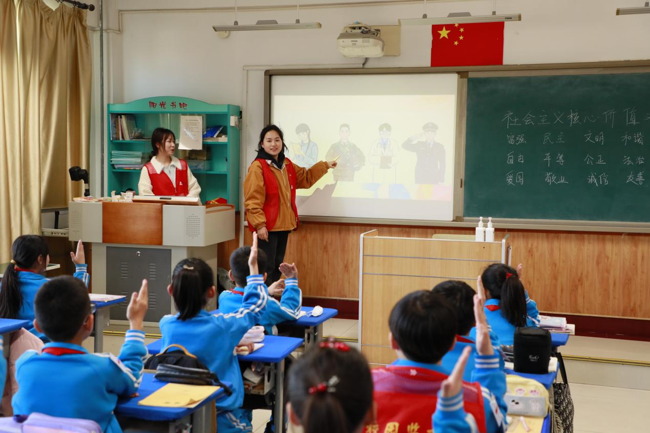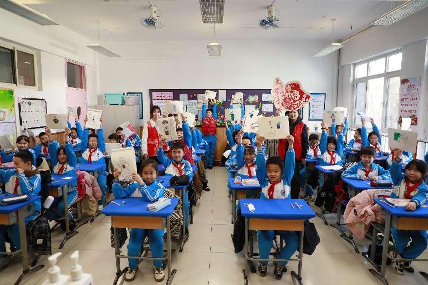 志愿者們走進河北省樂亭縣第三實驗小學,為六年級的同學們講授“海洋強國”主題活動課。志愿者詳細介紹航空母艦的具體布局、起飛和停機過程、建造歷史,激發同學們熱愛海洋、探索海洋的責任感和使命感。志愿者為小學生講述身邊的“雷鋒”事跡,共同合唱《學習雷鋒好榜樣》,一起手工制作雷鋒包,傳承新時代雷鋒精神。在西青區辛口鎮中心小學,志愿者為小學生們帶來一場生動的“美育+思政”課程“時代雷鋒”,志愿者講述雷鋒同志的感人事跡和美好品德,使小學生們正確理解雷鋒精神的內涵實質,又講述了來自各行各業勇于奉獻、擔當作為的典型案例,讓小學生們深刻認識雷鋒精神的時代內涵。同時,志愿者與小學生們一起圍繞雷鋒故事進行繪畫創作,用手中的畫筆畫出自己心中的雷鋒形象,鼓勵同學們繼承雷鋒精神,傳承紅色基因。