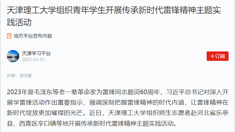 2023年是毛澤東等老一輩革命家為雷鋒同志題詞60周年,習近平總書記對深入開展學雷鋒活動作出重要指示,強調深刻把握雷鋒精神的時代內涵,讓雷鋒精神在新時代綻放更加璀璨的光芒。近日,天津理工大學組織師生志愿者赴河北省樂亭縣、西青區辛口鎮等地開展傳承新時代雷鋒精神主題實踐活動。