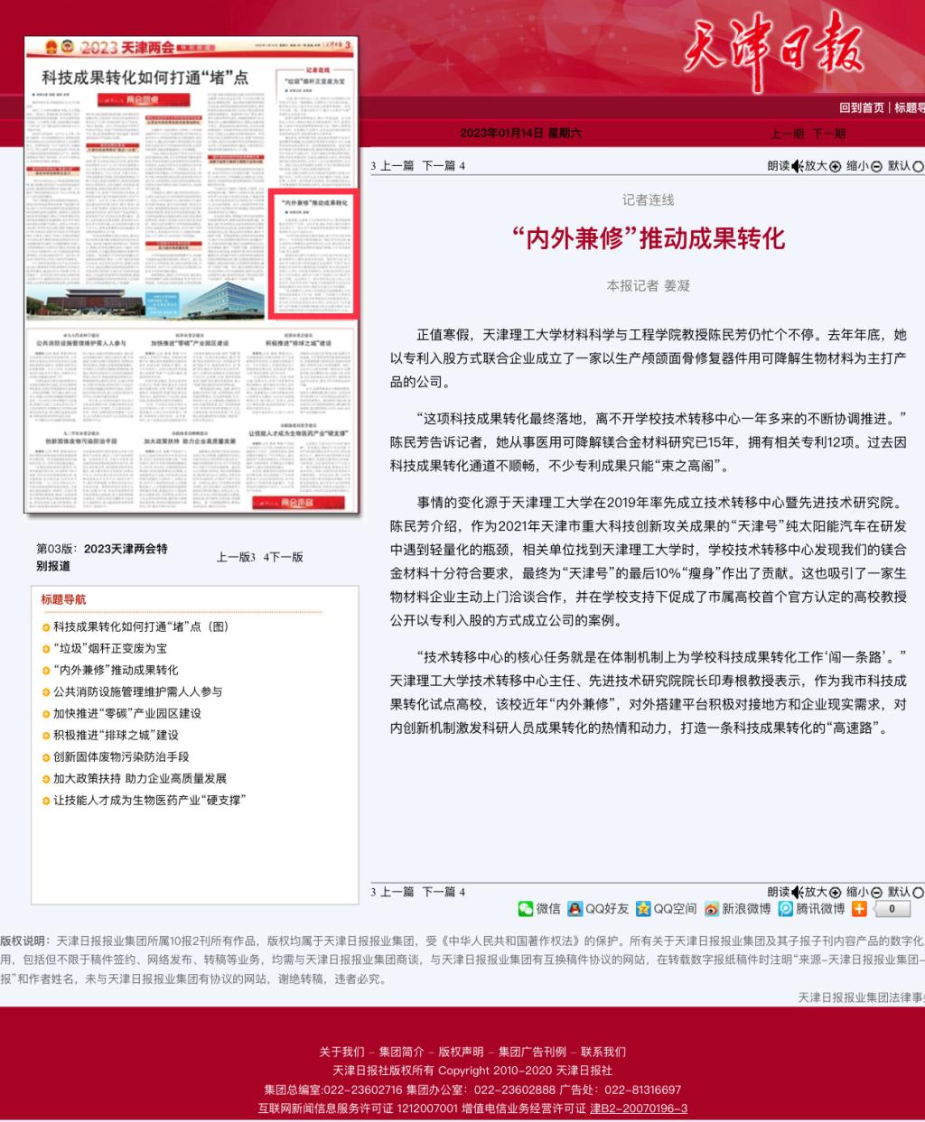 1月14日,《天津日?qǐng)?bào)》第3版“2023天津兩會(huì)特別報(bào)道”專版“記者連線”欄目采訪我校先進(jìn)技術(shù)研究院院長(zhǎng)印壽根和材料科學(xué)與工程學(xué)院教授陳民芳,報(bào)道學(xué)校對(duì)外搭建平臺(tái)積極對(duì)接地方和企業(yè)現(xiàn)實(shí)需求,對(duì)內(nèi)創(chuàng)新機(jī)制激發(fā)科研人員成果轉(zhuǎn)化的熱情和動(dòng)力,“內(nèi)外兼修”打造科技成果轉(zhuǎn)化“高速路”的經(jīng)驗(yàn)做法,內(nèi)容如下: