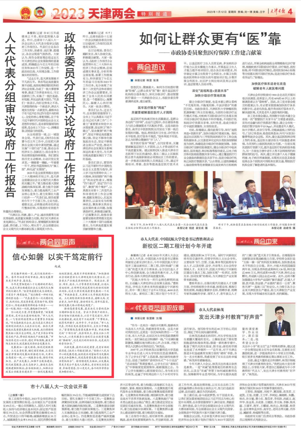 1月12日,《天津日報》第4版“2023天津兩會特別報道”專版刊發采訪市政協委員、我校電氣工程與自動化學院教授周雪松的文章“信心如磐 以實干篤定前行”,周雪松教授建議以創新驅動縱深推進京津冀協同發展,加快優勢互補,促進要素優化配置,打造從原始創新、應用研究到成果轉換的協同創新共同體,內容如下: