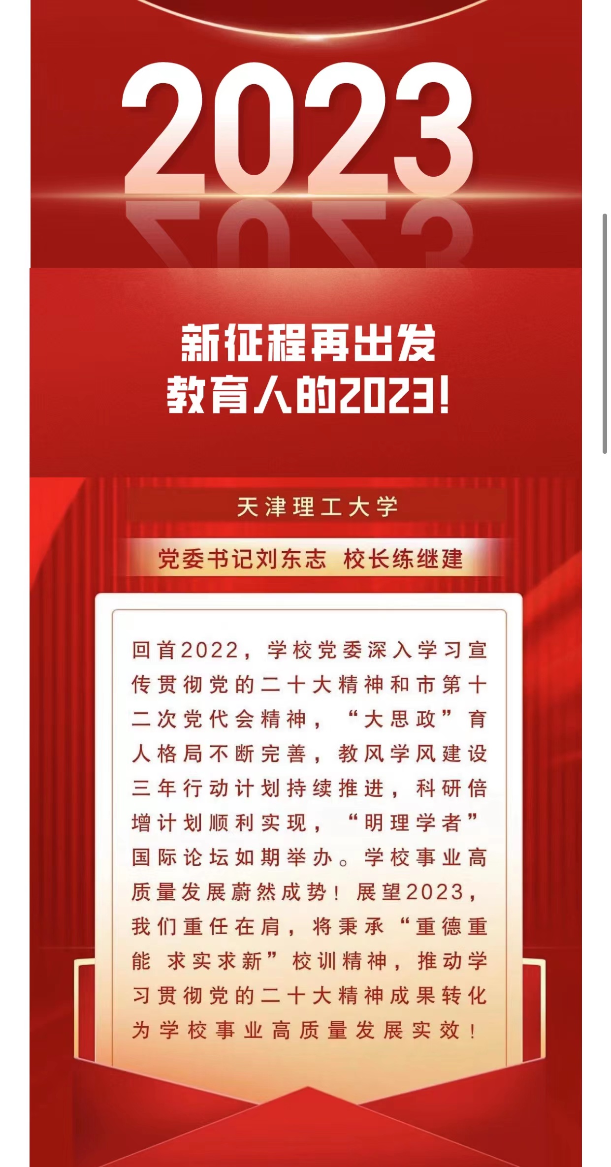 律回春漸,新元肇啟。1月1日,天津教育報(bào)公眾號在“新征程再出發(fā) 教育人的2023(高校篇)”刊發(fā)我校黨委書記劉東志、校長練繼建的2023年新年賀詞,賀詞回首2022年、展望2023,新的一年全體天理人將秉承“重德重能 求實(shí)求新”校訓(xùn)精神,推動學(xué)習(xí)貫徹黨的二十大精神成果轉(zhuǎn)化為學(xué)校事業(yè)高質(zhì)量發(fā)展實(shí)效,內(nèi)容如下:
