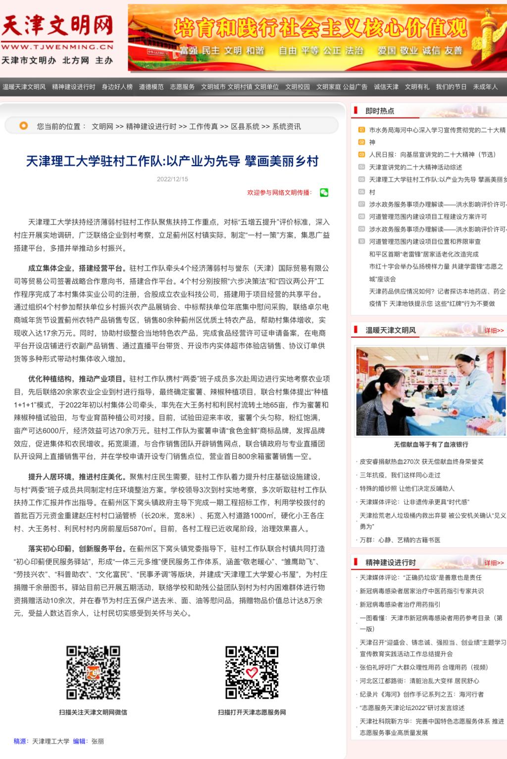 12月15日,天津文明網關注報道我校派駐薊州區下窩頭鎮扶持經濟薄弱村駐村工作隊,聚焦扶持工作重點,對標“五增五提升”評價標準,深入村莊開展實地調研,廣泛聯絡企業到村考察,立足薊州區村鎮實際,制定“一村一策”方案,集思廣益搭建平臺,多措并舉推動鄉村振興的先進事跡,內容如下: