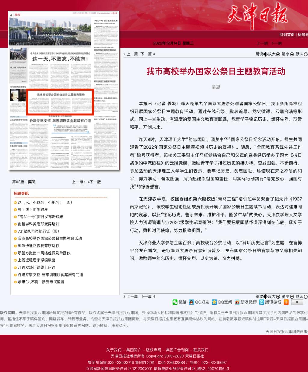12月14日,《天津日報》在第3版報道我校開展“勿忘國恥、圓夢中華”國家公祭日紀念活動,“全國教育系統(tǒng)先進工作者”稱號獲得者、關(guān)工委副主任馬紅健結(jié)合自己和父輩的親身經(jīng)歷舉辦題為《抗日戰(zhàn)爭的中流砥柱》的云端黨課,激勵青年學(xué)子接過歷史的接力棒,奮發(fā)圖強、不斷前行,內(nèi)容如下: