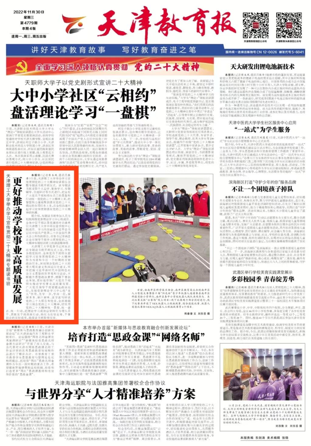 11月30日,《天津教育報》在頭版報道我校舉辦學習宣傳貫徹黨的二十大精神專題讀書班,把全校廣大黨員干部和師生員工的思想和行動統一到黨的二十大精神上來,把智慧和力量凝聚到落實黨的二十大確定的各項任務上來,在全校迅速興起學習宣傳貫徹落實黨的二十大精神的熱潮,更好推動學校事業高質量發展,內容如下: