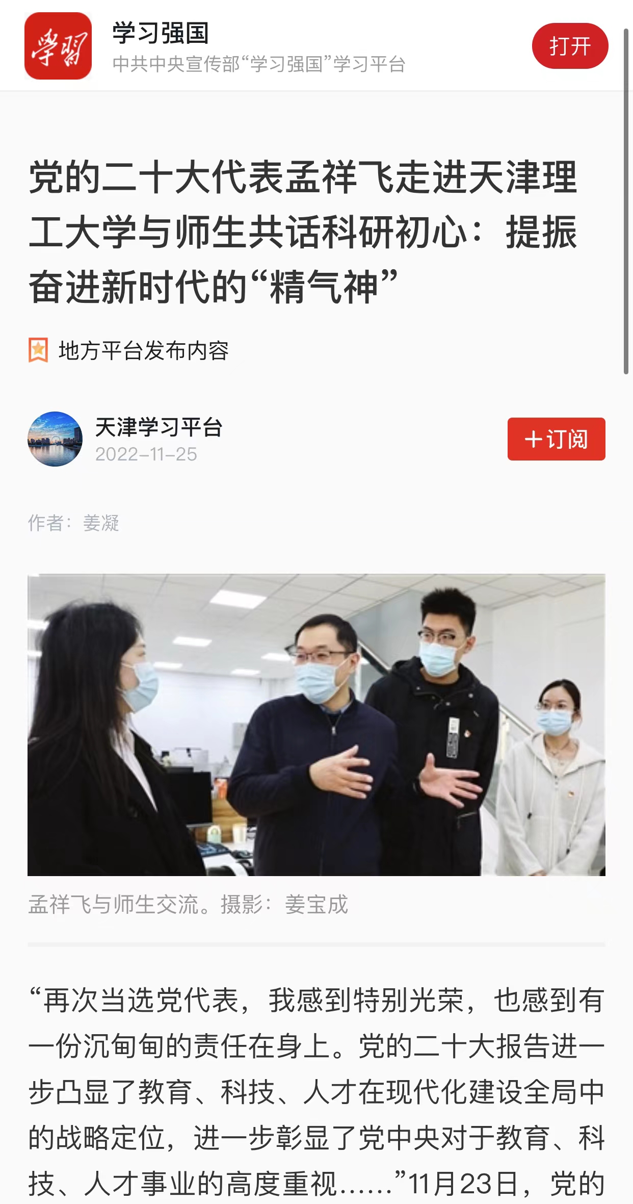 11月25日,學習強國學習平臺報道黨的二十大代表、國家超級計算天津中心黨組書記孟祥飛受邀走進我校,給師生代表帶來一場生動的“自信自立自強,讓黨的二十大精神落地生根”的專題輔導報告并與師生共話科研初心,在入情入理的切身體會分享中講“透”理論、講“實”成就、講“活”經驗,提振廣大師生永遠跟黨走、奮進新時代的“精氣神”的情況,內容如下: