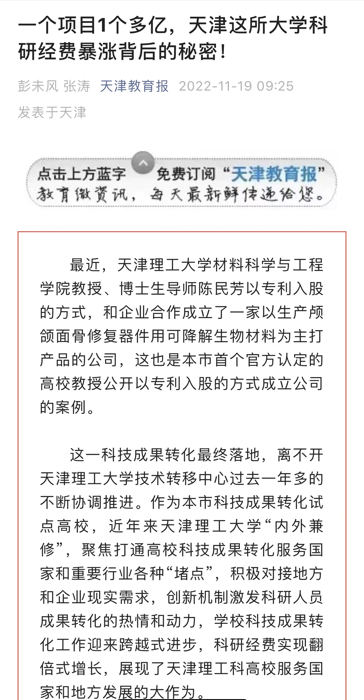最近,天津理工大學材料科學與工程學院教授、博士生導師陳民芳以專利入股的方式,和企業合作成立了一家以生產顱頜面骨修復器件用可降解生物材料為主打產品的公司,這也是本市首個官方認定的高校教授公開以專利入股的方式成立公司的案例。