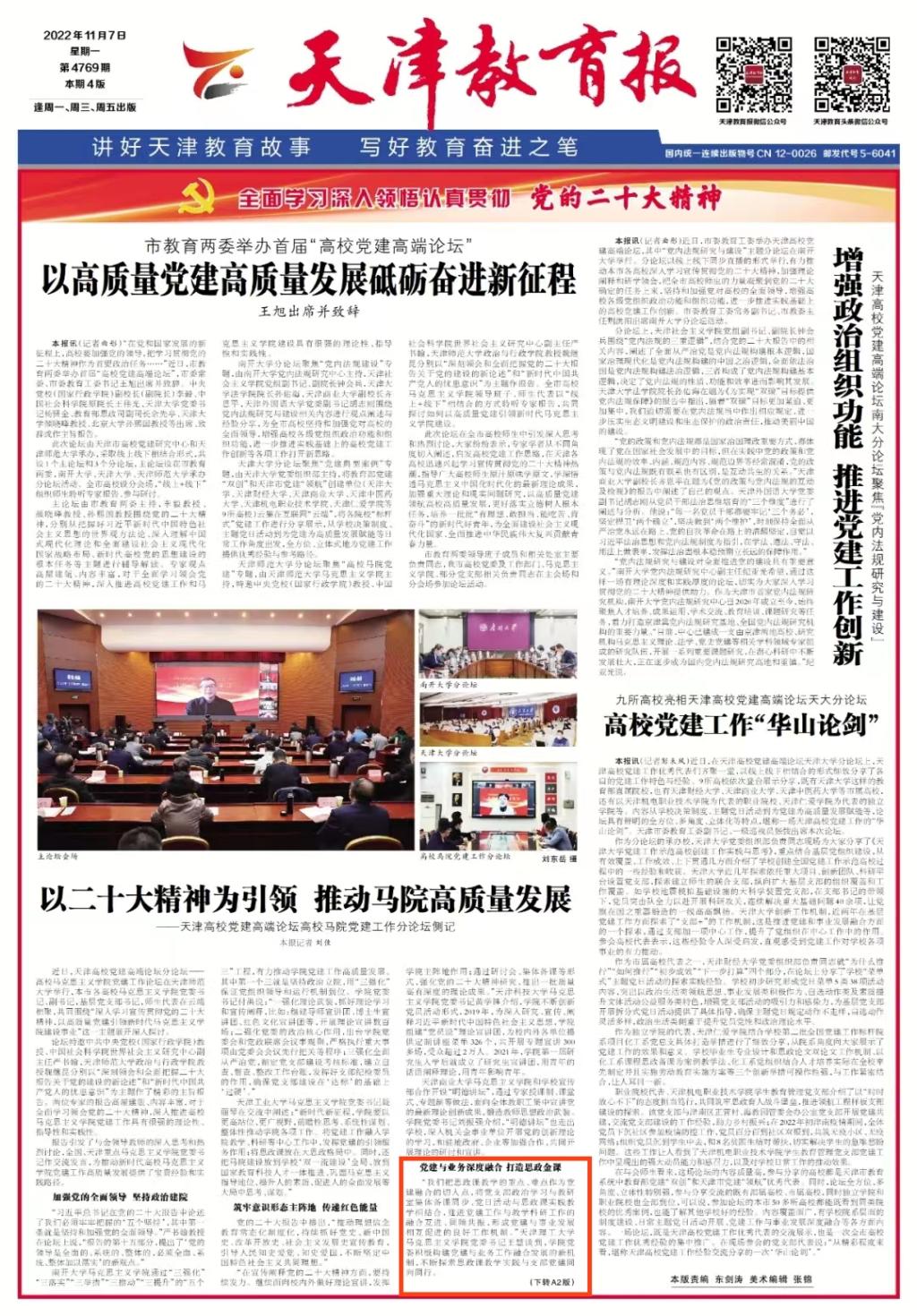 日前,市教育兩委舉辦首屆“高校黨建高端論壇”,11月7日,《天津教育報(bào)》在第一版報(bào)道我校馬克思主義學(xué)院黨委書記王慧在天津高校黨建高端論壇馬院黨建工作分論壇發(fā)言情況,內(nèi)容如下: