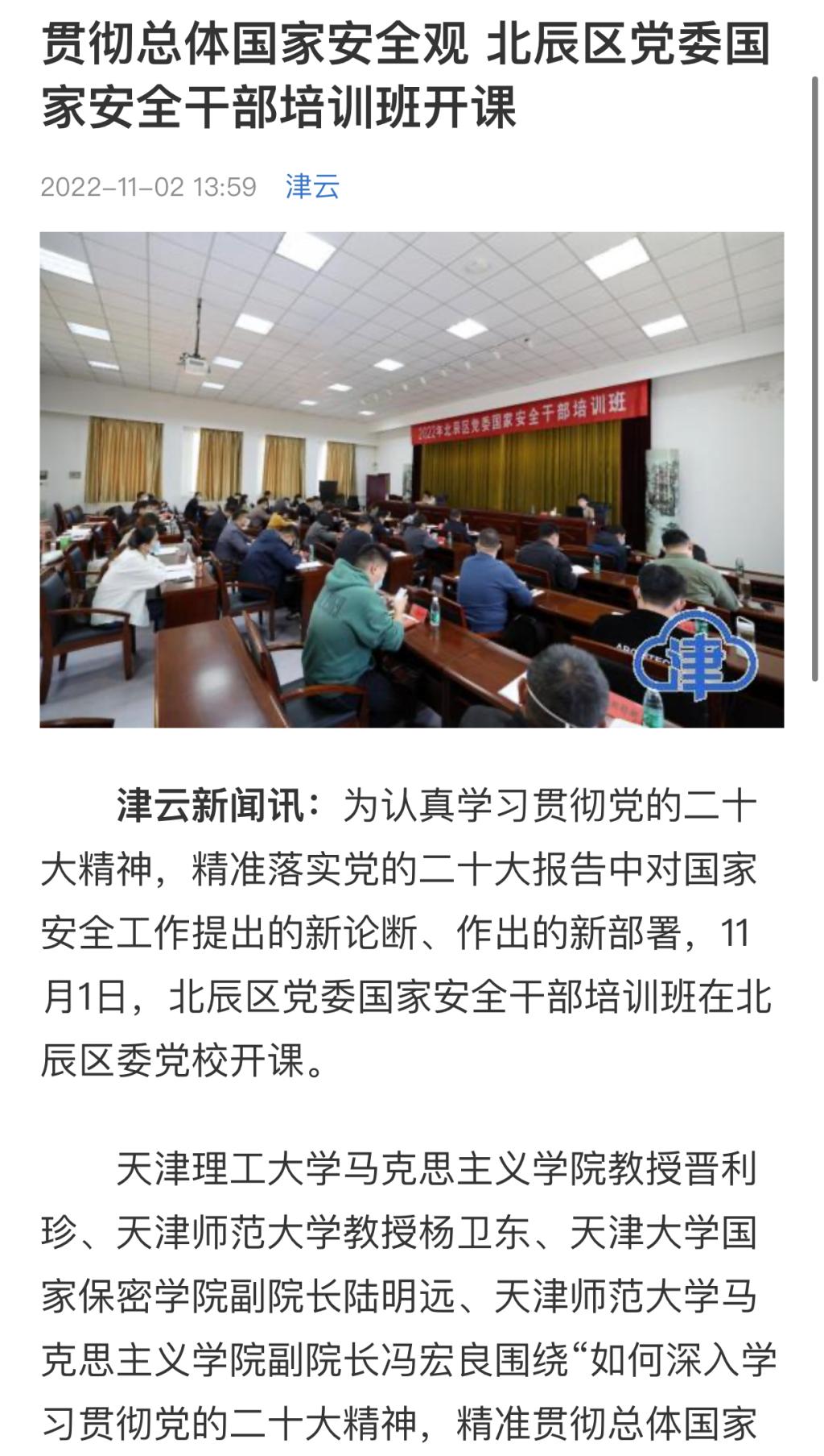 為認真學習貫徹黨的二十大精神,精準落實黨的二十大報告中對國家安全工作提出的新論斷、作出的新部署,11月1日,北辰區黨委國家安全干部培訓班在北辰區委黨校開課。