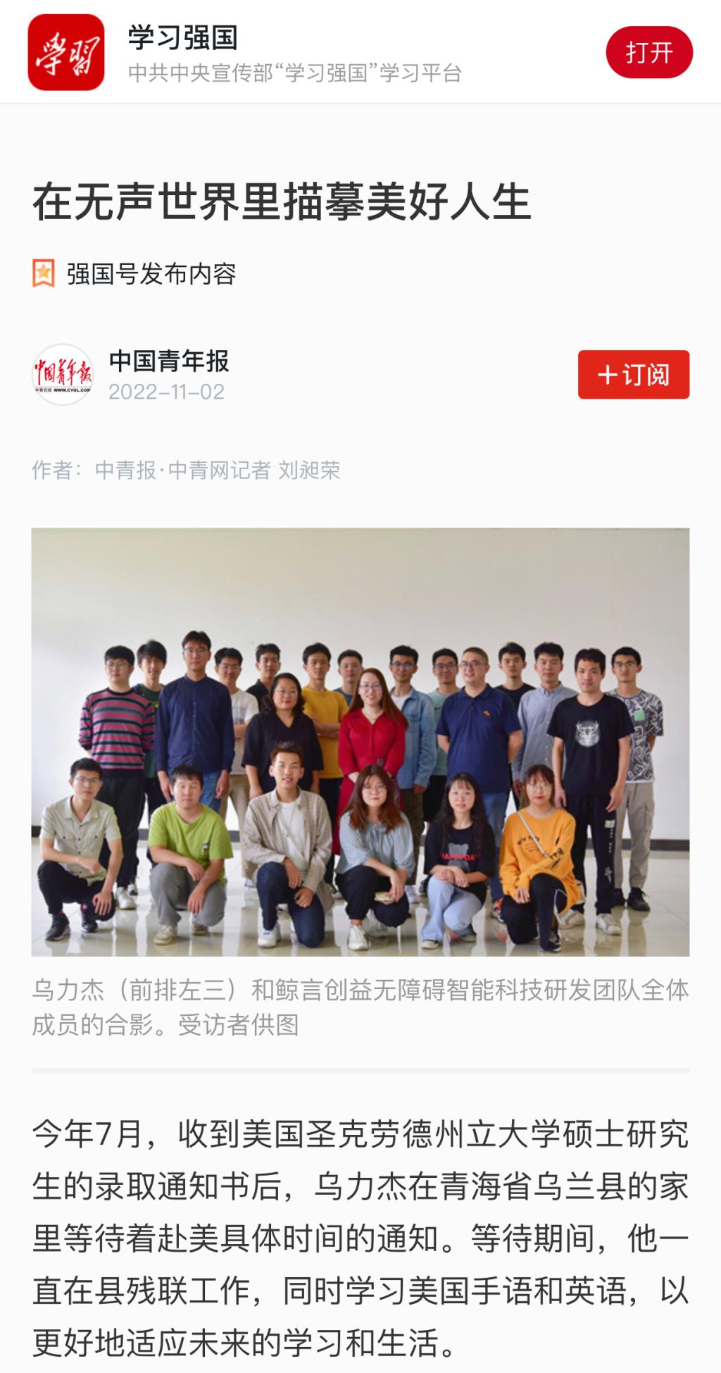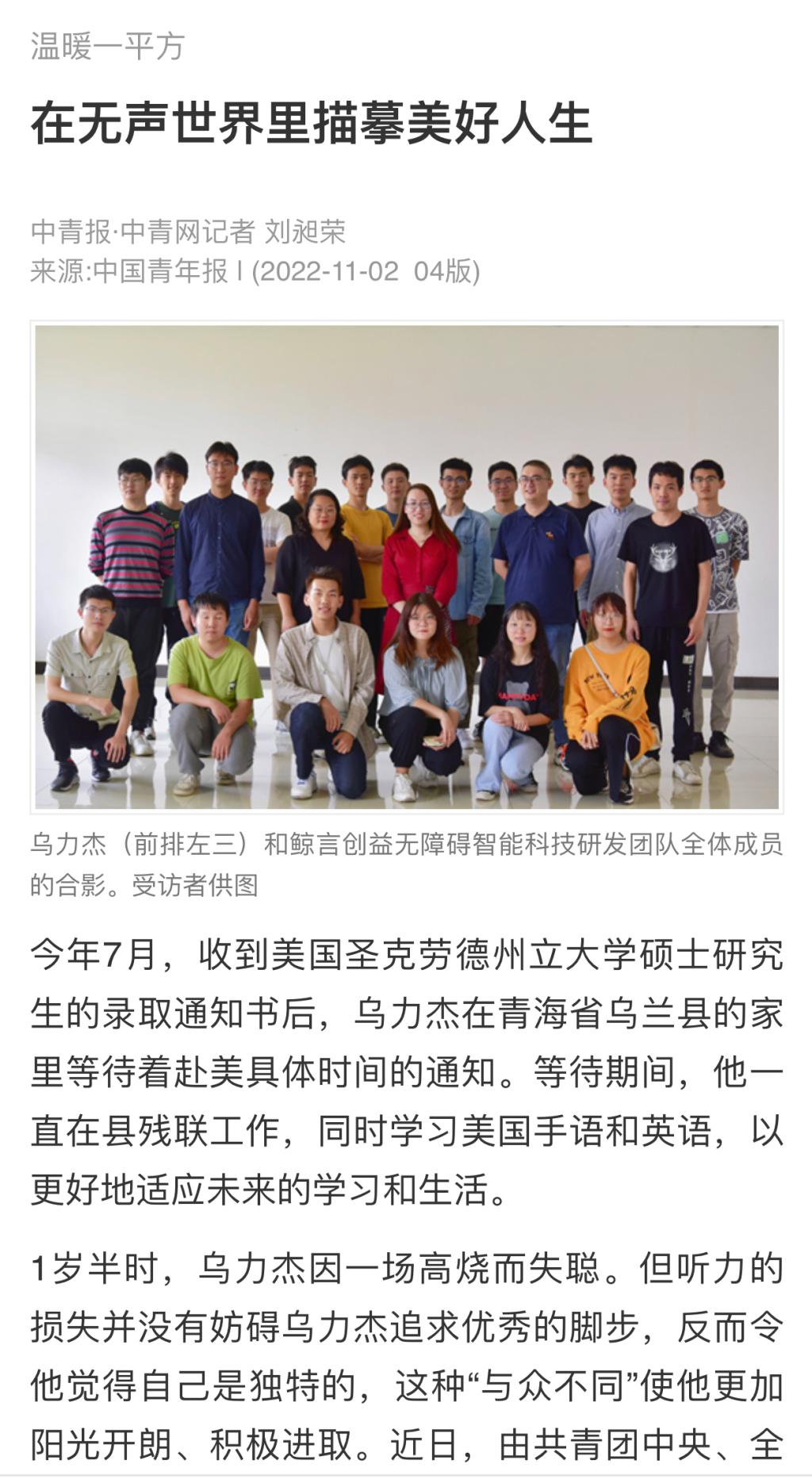 11月2日,《中國青年報》第4版、學習強國平臺以“在無聲世界里描摹美好人生”為題,報道2021年度“中國大學生自強之星”、我校聾人工學院2022屆計算機科學與技術(shù)專業(yè)畢業(yè)生烏力杰的青春奮進故事,內(nèi)容如下: