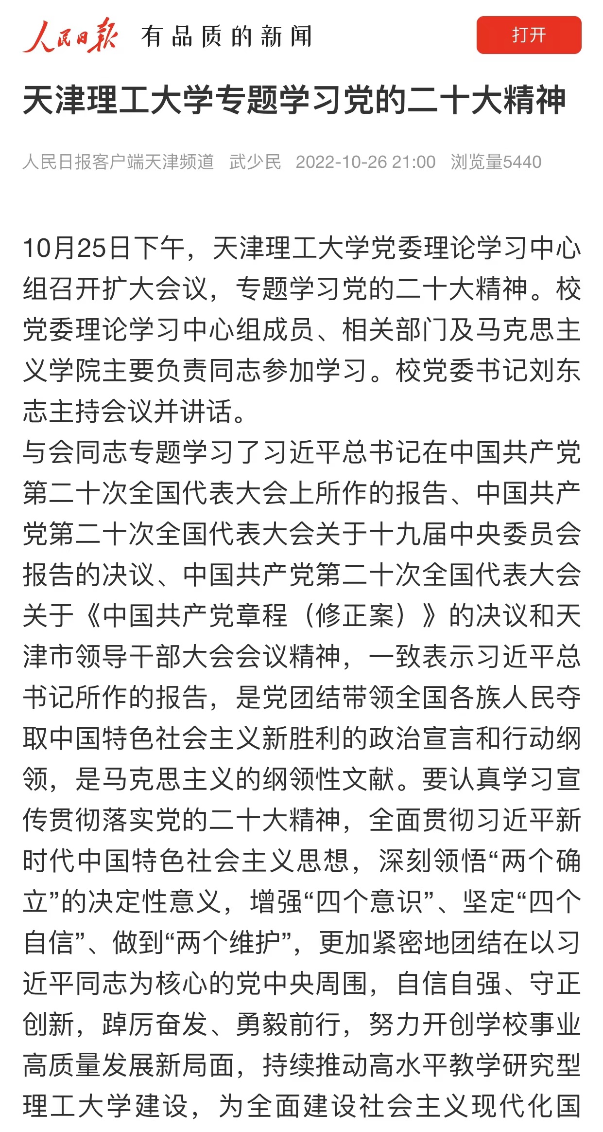 10月26日,人民日報客戶端報道校黨委理論學習中心組召開擴大會議,專題學習黨的二十大精神情況,內容如下: