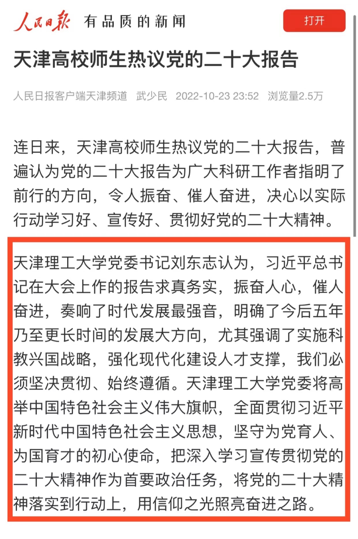 天津理工大學(xué)黨委書記劉東志認(rèn)為,習(xí)近平總書記在大會(huì)上作的報(bào)告求真務(wù)實(shí),振奮人心,催人奮進(jìn),奏響了時(shí)代發(fā)展最強(qiáng)音,明確了今后五年乃至更長(zhǎng)時(shí)間的發(fā)展大方向,尤其強(qiáng)調(diào)了實(shí)施科教興國(guó)戰(zhàn)略,強(qiáng)化現(xiàn)代化建設(shè)人才支撐,我們必須堅(jiān)決貫徹、始終遵循。天津理工大學(xué)黨委將高舉中國(guó)特色社會(huì)主義偉大旗幟,全面貫徹習(xí)近平新時(shí)代中國(guó)特色社會(huì)主義思想,堅(jiān)守為黨育人、為國(guó)育才的初心使命,把深入學(xué)習(xí)宣傳貫徹黨的二十大精神作為首要政治任務(wù),將黨的二十大精神落實(shí)到行動(dòng)上,用信仰之光照亮奮進(jìn)之路。