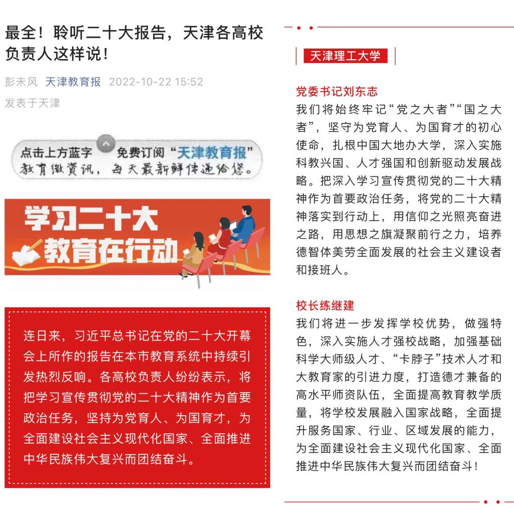 10月22日,天津教育報刊發我校黨委書記劉東志、校長練繼建熱議黨的二十大報告情況,內容如下: